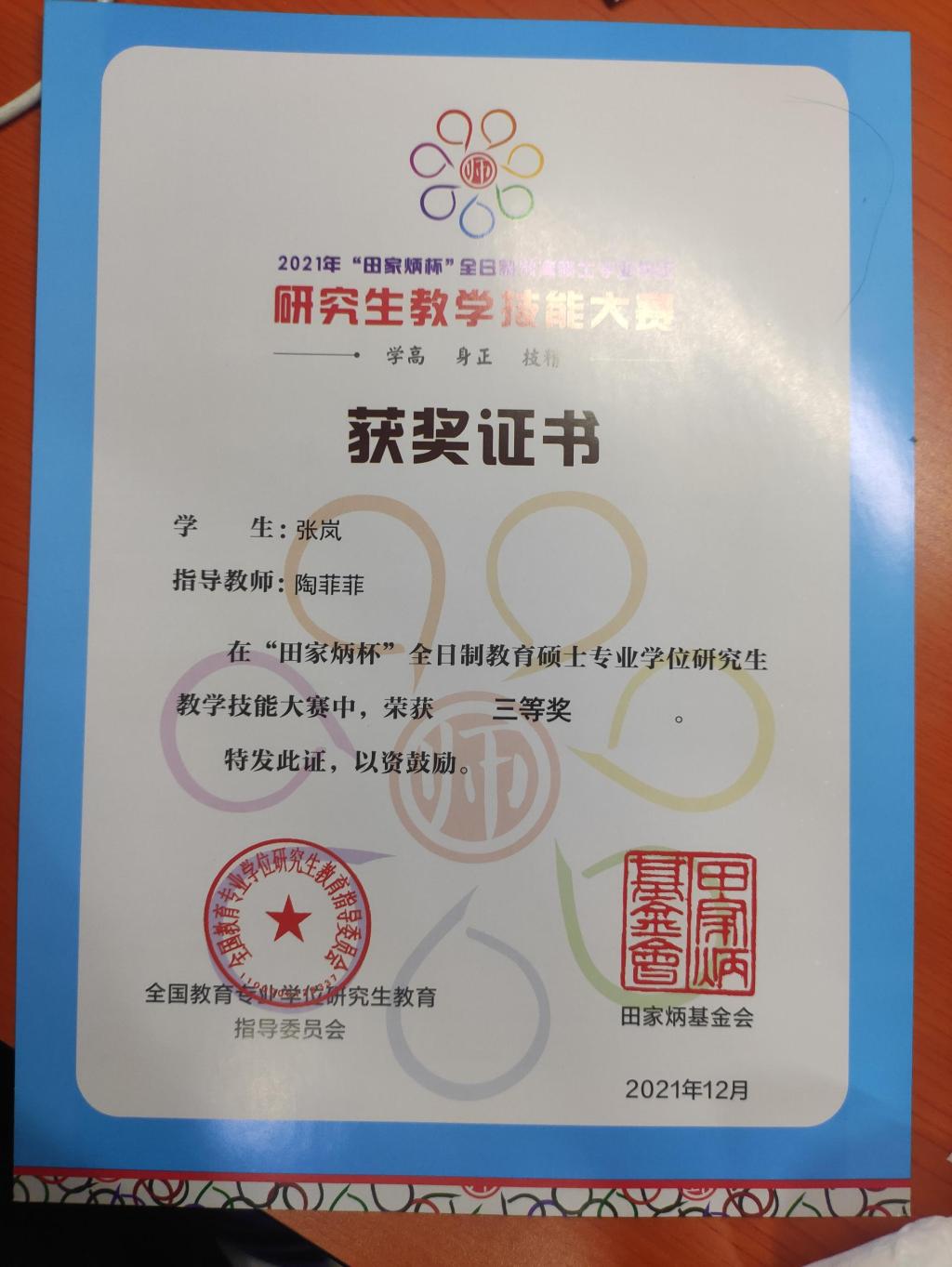 银河国际 2020级学科教学(化学)专业张岚同学,在“2021年‘田家炳杯’全日制教育硕士专业学位研究生教学技能大赛”中,经过激烈的角逐,获得全国三等奖。