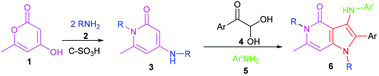 A multicomponent two-step strategy for the synthesis of polysubstituted pyrrolo[3,2-c]pyridin-4-one derivatives has been described. The reactions can be readily performed by mixing inexpensive starting materials using two-step methods under mild conditions, and the products can be easily obtained from the mother liquid without any further treatment. Moreover, the solid acid catalyst can be circulated at least 6 times without obvious deactivation. Furthermore, a mechanism for the reaction process has been proposed. Overall the bond forming efficiency, the use of green solvent as the reaction medium, recyclability of the solid acid catalyst, easy work-up/purification, and a wide substrate scope make this method highly attractive to assemble heterocyclic scaffolds.