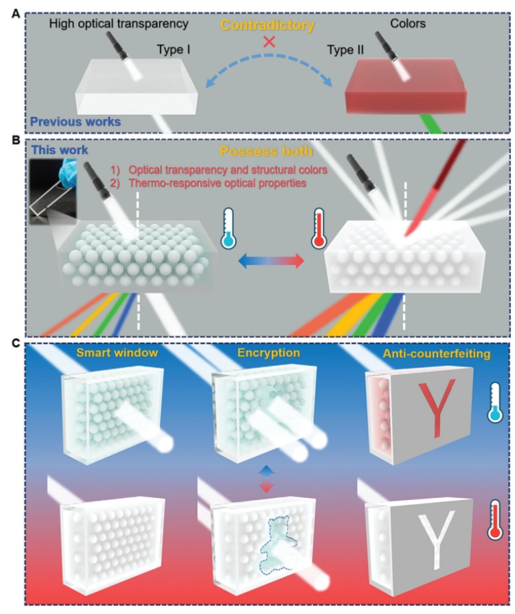 在此基础上,作者通过结构设计,制备了具有折射率匹配、晶面间距大及非密堆积有序结构的 “二氧化硅/聚合物单体” 新型热响应液态光子晶体智能窗户(图2)。该智能窗户表现出:1)高透明度(94%)、明亮的前向散射结构色和极弱的反射结构色和2)动态可调的透过率(24-94%)和结构色饱和度(1-55倍),解决了传统热响应智能窗户高透明度和明亮颜色不能兼顾且不易调的问题。此外,作者实现了基于该智能窗户材料的信息加密和防伪技术。相关研究成果以“Structural color-based smart liquid windows address the tradeoff between high optical transparency and brilliant color”为题在中科院1区、国际顶级期刊《Advanced Functional Materials》上发表。