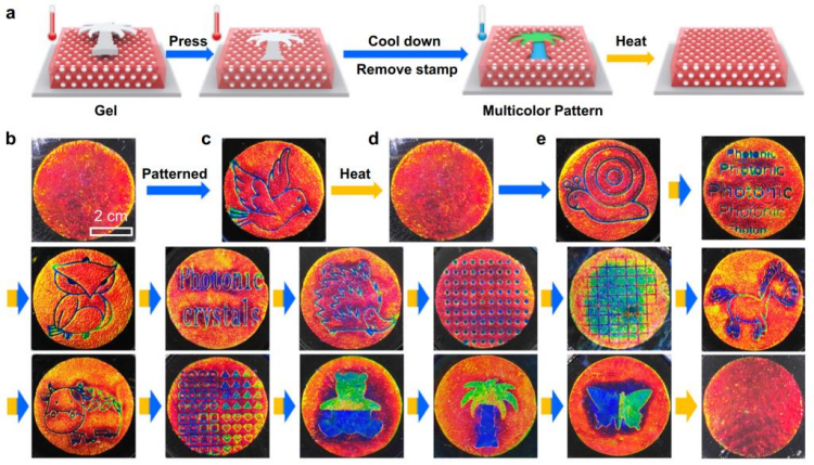 力致色变光子晶体因具有通过外力改变结构色的特性受到广泛关注。然而,撤去外力后,力致色变结构色迅速恢复且难以记录,限制了其应用拓展。本文作者通过结合非密堆积力致色变光子晶体和相变材料,制备了一种具有热开-关特性和多色记录-擦除功能的新型力致色变光子晶体纸张。通过在相变温度以上挤压光子晶体纸张获得目标结构色,随后冷却至室温记录目标结构色。通过加热挤压后的光子晶体纸张,可对已记录的结构色进行擦除。基于上述特性,作者发展了基于光子晶体纸张的新型多色、高分辨无油墨印刷术,实现了对同一纸张重复擦写(图1)。该新型光子晶体纸张的发展和大范围使用将有助于减少环境污染、一次性油墨和纸张的使用。相关研究成果以“Multicolor recordable and erasable photonic crystals based on on-off thermoswitchable mechanochromism toward inkless rewritable paper”为题在中科院1区、国际顶级期刊《Nature Communications》上发表。