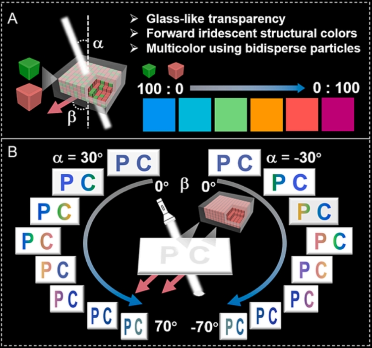 进一步,作者通过可控纳米材料可控组装与复合,获得了具有前向结构色、高透明度的固态光子晶体结构色材料,并实现了基于观察角度变色的新型防伪技术(图3),相关研究成果以“Metal-organic framework photonic crystals with bidisperse particles-based brilliant structural colors and high optical transparency for elaborate anti-counterfeiting”为题在中科院1区、国际顶级期刊《Journal of Colloid and Interface Science》上发表。