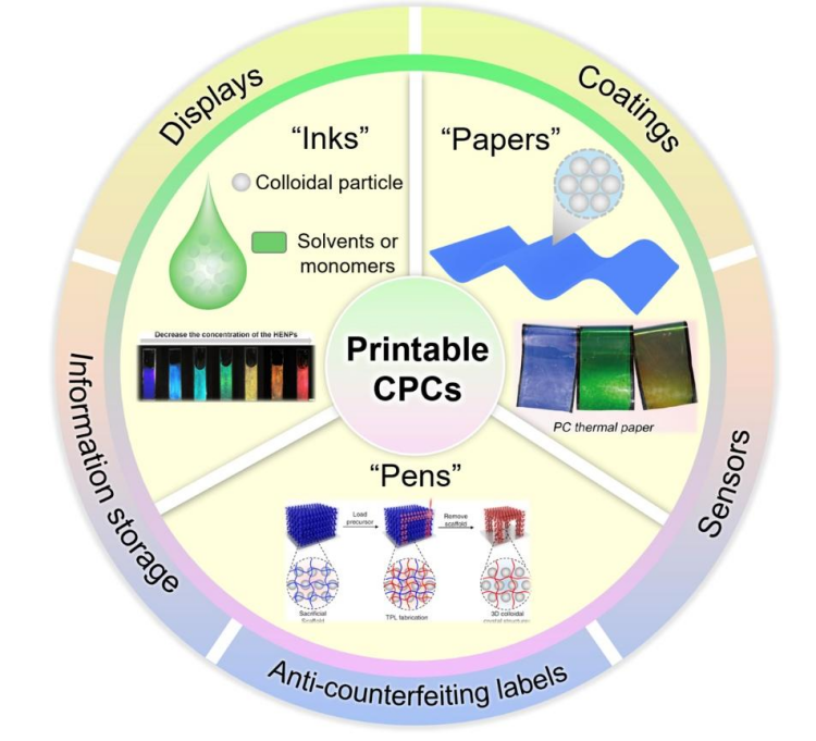 此外,作者总结了光子晶体结构色功能材料在传感(图4)、印刷(图5)等领域的进展,相关综述成果以“Smart colloidal photonic crystal sensors”为题在中科院1区、国际顶级期刊《Advanced in Colloid and Interface Science》上发表;以“Progress in printable colloidal photonic crystals”为题在国际光学期刊《Advanced Photonics Research》上发表。