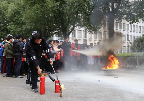 之后,越城区消防大队副大队长焦志高还为大家现场讲解了实验台面起火的灭火程序,并详细介绍了消防桶、灭火毯、ABC干式灭火器、二氧化碳灭火器的使用方法,并指导在场师生现场使用各式灭火器进行模拟灭火。