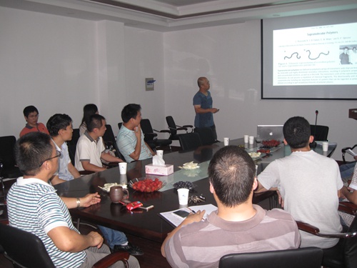 6月24日,美国康涅狄格州立大学教授、绍兴文理银河国际 鉴湖学者讲座教授林遥来浙江省精细化学品传统工艺替代技术研究重点实验室做了题为《Recent advances in supramolecular polymer and materials》的专题报告,林遥教授从超分子结构-反应机理-应用方面等不同层面向大家展示了超分子的优势以及最新的研究进展,学术报告后,如何将高分子材料和超分子材料结合起来解决现有的工业问题引起了大家的热议。