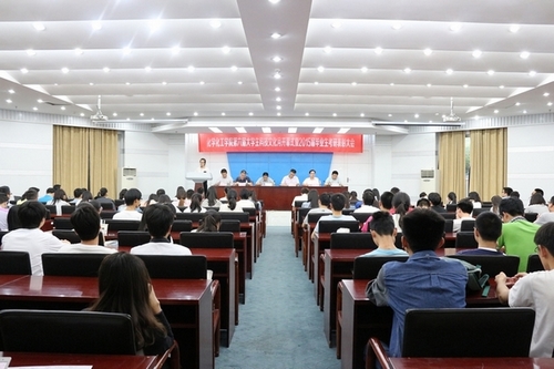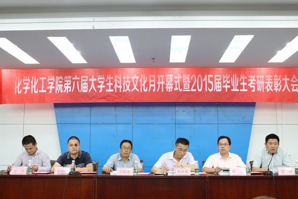 在图书馆一楼报告厅举行第六届大学生科技文化月开幕式暨2015届毕业生考研表彰大会,校学工部、团委负责人和银河国际