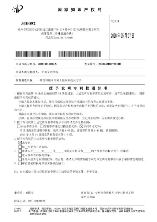 化学师范161班胡宁洋团队的发明专利申请获得授权,实现了学生发明专利授权零的突破。