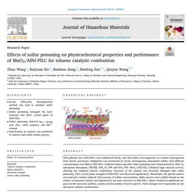 深入探索了硫中毒对MnO2/AlNi-PILC催化剂在甲苯催化燃烧过程中的性能和理化性质的影响,明确了MnO2/AlNi-PILC催化剂的硫中毒机理,为耐硫催化剂的制备工作提供了有效借鉴。