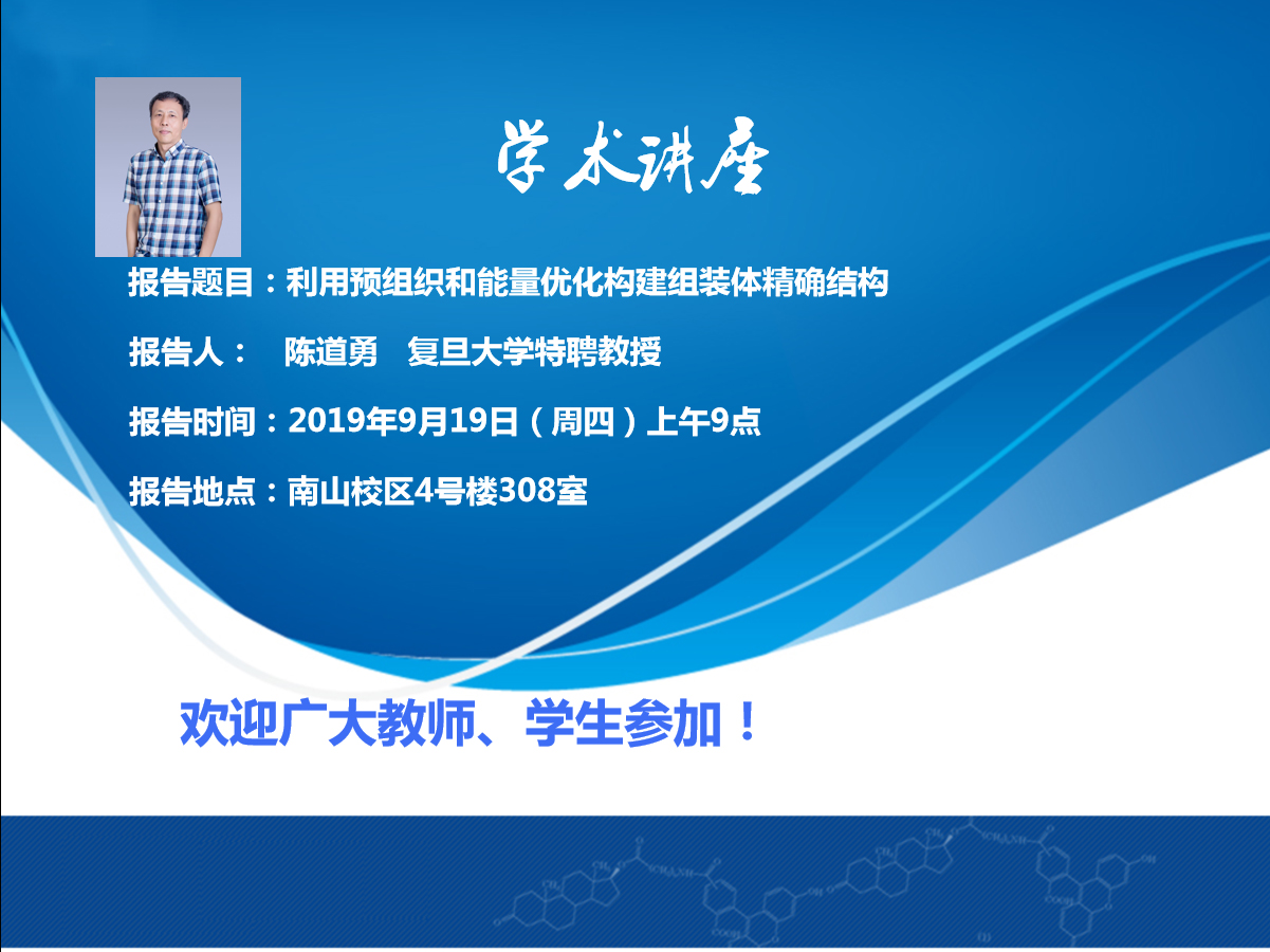 报告摘要:生命体善于通过自组装来构建复杂但精确的纳米结构,从而为生命系统的高效、高选择性的功能奠定基础。然而,构筑复杂但精确的自组装结构仍然是聚合物自组装领域所面临的挑战之一。最近,受生命体自组装的启发,我们发展了程序化的组装过程来构筑具有复杂但精确结构的聚合物组装体。首先,聚合物预组织成简单的纳米结构,使自组装的起始结构统一化。然后,通过控制体系的相互作用,使得能量最优化来引导结构的演化过程,使得组装体系从预组织的纳米结构演化到相对复杂但精确的纳米结构。例如,通过预组织嵌段共聚物成为具有惰性壳层和具有相互作用的核构成的聚合物胶束,在控制条件下,单分散的DNA链和胶束之间的络合作用导致单分散的串珠状结构,这是DNA/硬球络合体系中的能量最优化结构。然后,胶束形变所导致的进一步的能量优化引导串珠状结构的演化,组装体由较长的单分散串珠结构演化成为较短但也为单分散的串珠结构,最终形成单分散的核壳结构纳米线;在纳米线中,DNA链采用螺线管构象包裹在核壳结构的界面上,从而将DNA的精确序列结构印刻到纳米线核的表面,赋予该表面结构近乎基团水平的精确性。我们还证明了通过预组织和能量优化,可以获得纯净的单链Janus粒子,可以实现了在溶液中由ABC三嵌段(或AB两嵌段)共聚物向ABC三段(或AB两段)各向异性粒子的转化。
