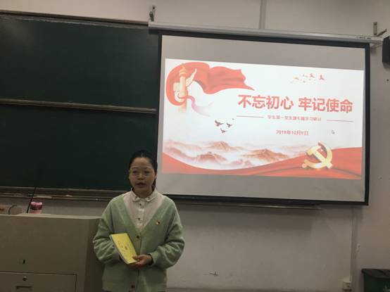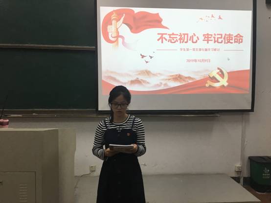 10月9日晚,理工楼221教室里灯火明亮,透过新改造的教学楼玻璃窗,显得格外耀眼。学生第一党支部党员聚集在这里,开展“不忘初心、牢记使命”主题教育专题党课和专题研讨活动。