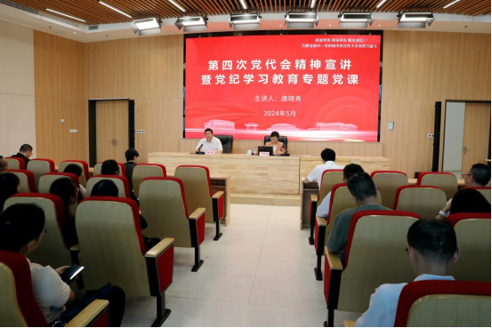 为深入贯彻落实省市党纪学习教育工作部署和���党委关于深入学习贯彻第四次党代会精神的要求,5月22日,校纪委书记唐晓青在风则江大讲堂107报告厅为我院党员教师作第四次党代会精神宣���暨党纪学习教育��题党课。党课报告由学院党委书记徐青主持。学院党政领导班子成员、科级以上干��、全体教师党员参加。