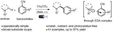 4月30日,冯高峰课题组在可见光催化合成领域取得重要进展,在Nature Index期刊《Organic Letters》上在线发表“Visible-Light-Induced α-Amino C–H Bond Arylation Enabled by Electron Donor–Acceptor Complexes”的研究论文。该研究揭示了叔胺与苯甲腈类化合物在可见光照射下,通过电子“给体—受体”络合物(EDA complex)可直接发生单电子转移,实现氮相邻sp3 C-H键的直接芳基化,得到苄胺类化合物。该方法无需金属、光催化剂和氧化剂,是目前使用试剂最少、操作最简单、最绿色的实现氮相邻sp3 C-H键的芳基化方法。