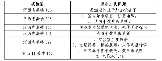 国庆假期临近,为扎实筑牢假期开放实验室安全防线,切实保障教学科研资产与师生安全,银河国际 安全检查小组于9月30日前往河西志廉实验楼、南山分析测试中心、脂溶性维生素浙江省工程研究中心、新能源研究所等重点区域,对各教学实验室与科研实验室开展全面检查。本次检查聚焦危化品储存与使用规范、消防设施有效性、过期药品处置、固液废弃物分类、实验室环境卫生等关键环节。经过认真检查和评估,安全小组发现少量问题和不足,现将存在问题的实验室进行通报并限期整改。